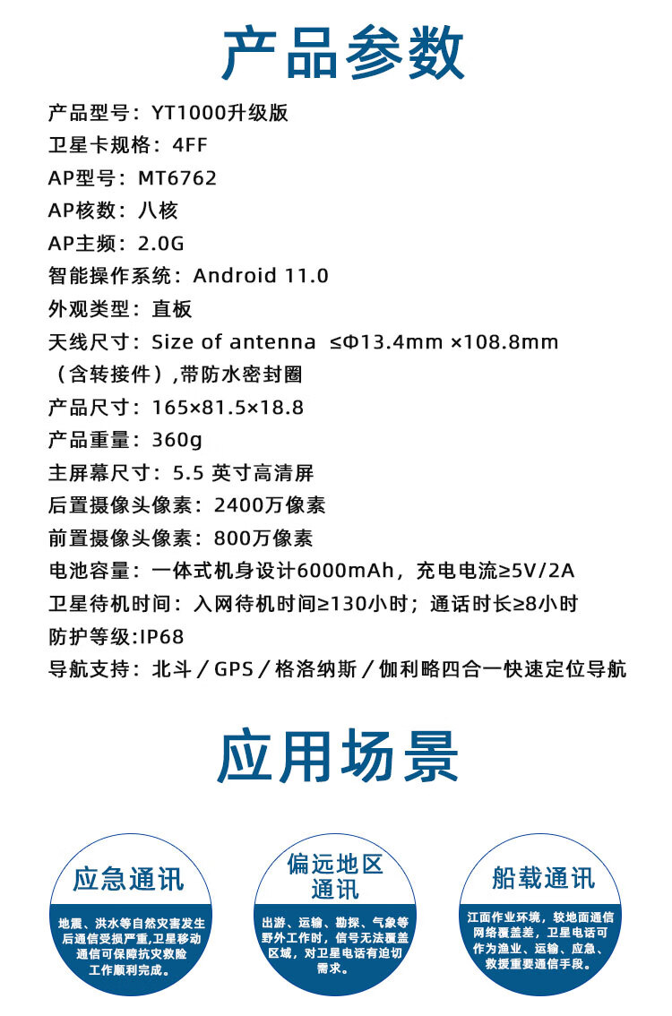 商品名称:麟云 YT1000 天通卫星电话双卡双待智能手机 户外应急三防救援(含2年资费套餐+手持全向天线)